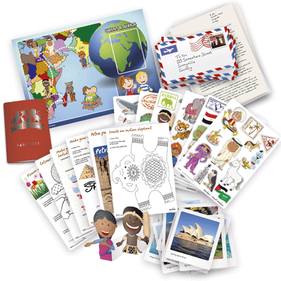 Discover Jordan, Egypt, India, Madagascar, South Africa & Zambia!Personalise your own oversized fun passport with photos, stickers & stamps from this wonderful part of the world. Start fun activities and play with the children of the world finger puppets.Join intrepid travelling twins, Sienna and Preston, on their travels around Africa and the Orient to discover wildlife, places, languages and unique cultures. They promise to share their adventures with you in their penpal letters!Passport Kit features: